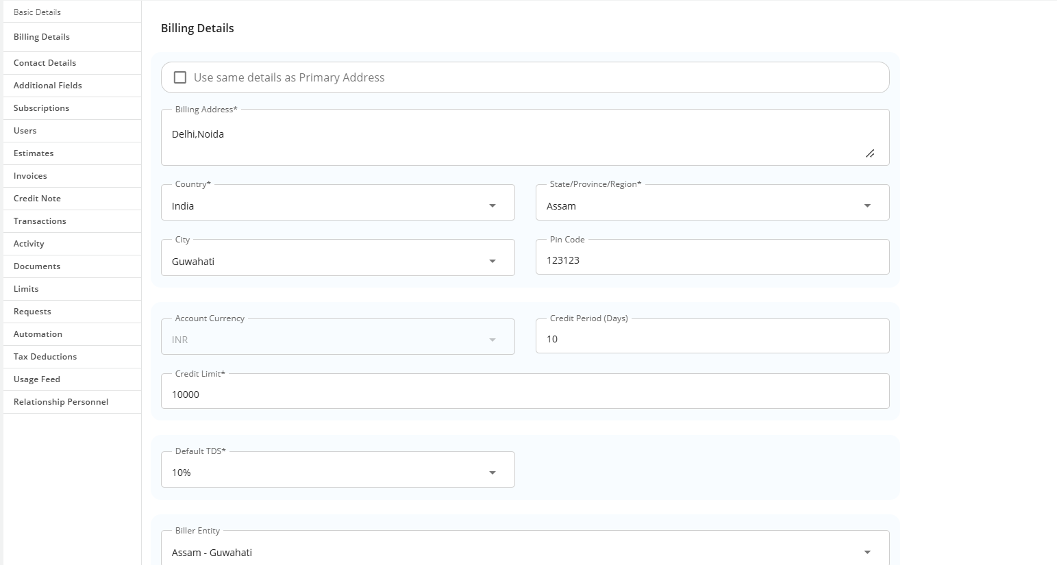 - To update credit period and credit limit, navigate to account details and update the field under theΒ Billing DetailsΒ sub-section.